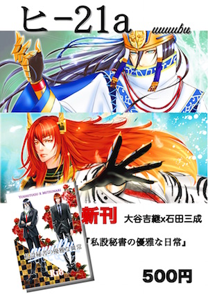冬コミ終了!ありがとうございました!! 2014年12月30日 HP 0 昨日はお寒い中、また雨で待機という過酷な中 お立ち寄りいただき 本当に本当に有難うございました! 新刊は訳のわからない政治ネタ←わかる人いるのか状態 だしまだ大谷さんのスーツ描いてないし。 お楽しみいただけましたかね。 おまけは大谷マスクといいつつただのマスクです みなさんお身体にはお気をつけて ほんとに寒かったよおおお!雪でなくてよかったよーーー! でも楽しかったです さこみつ時代から来てくださってるかた嬉しいです! 趣味があっててよかったです みなさんありがとうございました! よかったら感想とかお待ちしております。 次は春あたりか…未定ですが 相方ちゃんが その後行った年末恒例のライブの最中に『ネタ降臨!』と いうのでがっつり関ヶ原かも ここいらで ムカーーーーシのTBSのドラマの”関ヶ原”が大好きなんですよ。 DVD買ったんだけどね。 高橋幸治の大谷さんがかっこいいかっこいい! 森シゲの家康も最高なんだよ あと、孫市の映画も面白いよね。関係ないけど。 というわけで みなさん良いお年を! またどこかでお会いできたら幸いです。